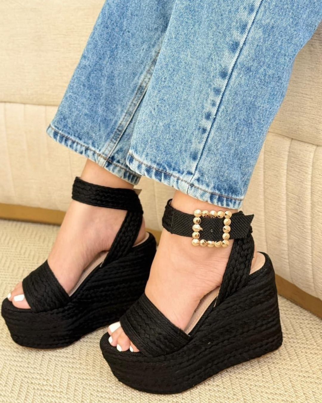 plataformas hechas de yute tejido artesanal con detalles en herrajeria de lujo